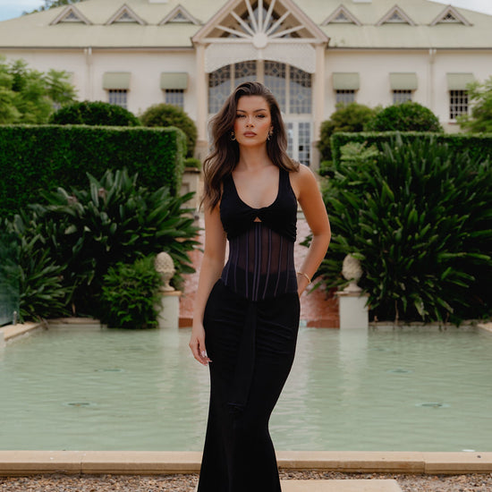 The Maya Set features a sheer mesh waist corset that cinches and snatches the waist, creating a beautifully sculpted silhouette without restriction. It is paired with a sleek, figure-hugging maxi skirt crafted from a buttery-soft stretch fabrication that feels weightless on the body.